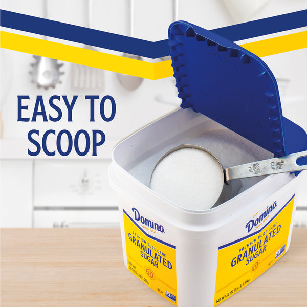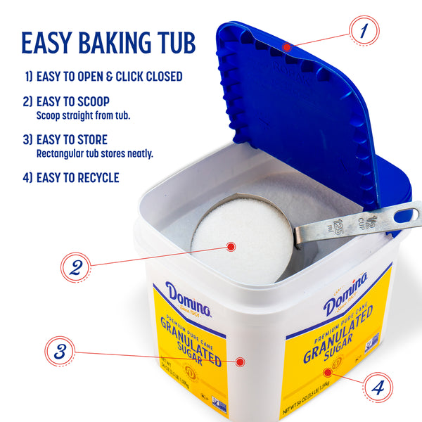 Since 1901, Domino® Sugar has been the trusted partner for generations of bakers. Our commitment to quality and expert craftsmanship is our enduring promise to you. We use the highest standard to maintain the naturally sweet flavor found in the sugarcane plant. Our Easy Baking Tub will make your baking more convenient. Domino Granulated Sugar is scoopable directly from the tub which clicks closed for confident resealing. Plus, the rectangular tub is easy to store.